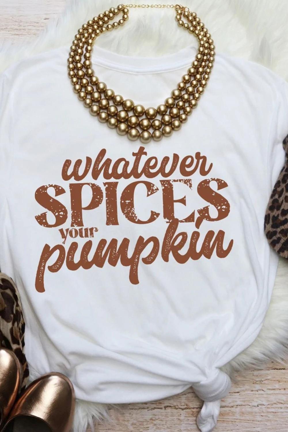 • Embrace The Autumn Spirit With This White "Whatever Spices Your Pumpkin" Letter Print Graphic Tee.